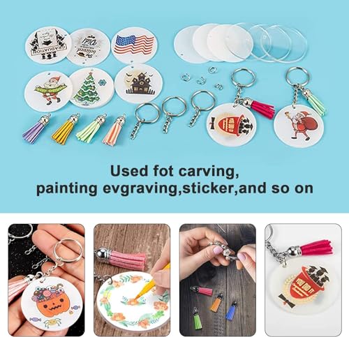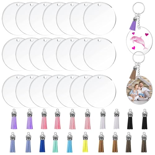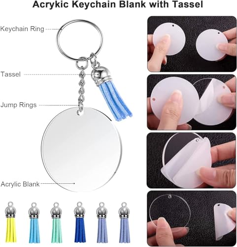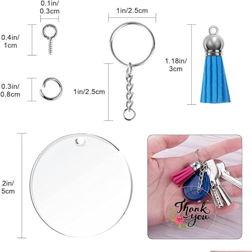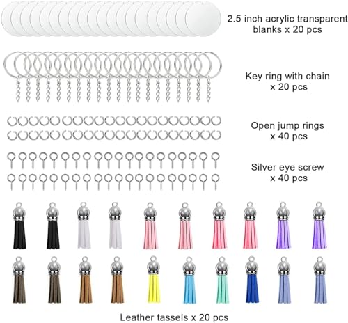 - مجموعة حلقات مفاتيح دائرية شفافة من الاكريليك - سوف تحصل على 20 قطعة دائرية فارغة من الاكريليك، 20 قطعة من قلادات الشرابة الجلدية الملونة، 20 قطعة من حلقات المفاتيح مع سلسلة، 40 قطعة من حلقات الوصل، 40 قطعة من العيون اللولبية الصغيرة، إجمالي 140 قطعة، مجموعة متنوعة من القطع المطابقة، يمكنك صنعها وفقًا لتفضيلاتك الخاصة