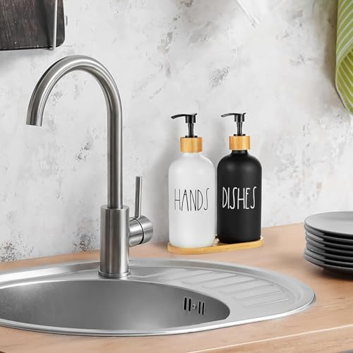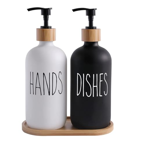 Andgogo - مجموعة موزع صابون زجاجي مع مضخة لليدين والاطباق من اندجوجو مع صينية سميكة من الخيزران - مناسبة لديكور المنزل الريفي الحديث (ابيض واسود)