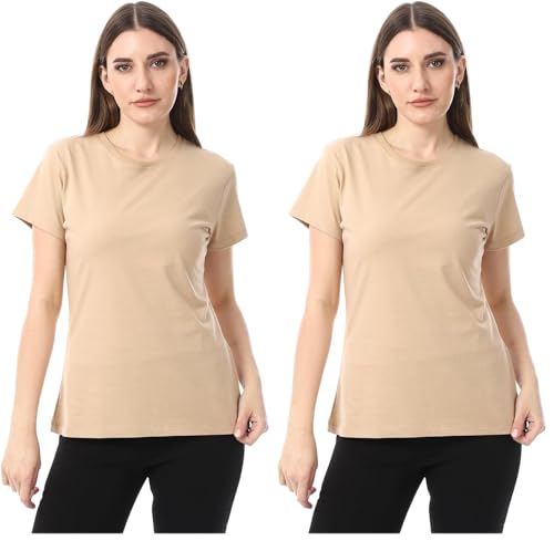 Andora - تيشرت بيسيك برقبة دائرية سهل الارتداء من اندورا، لون بيج، مقاس 3XL (عبوة من قطعتين)