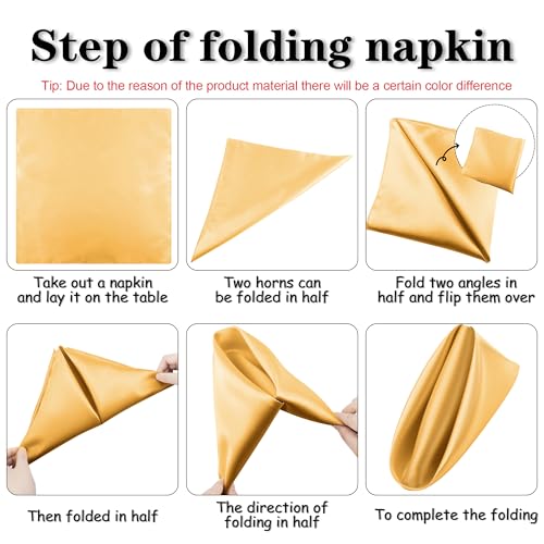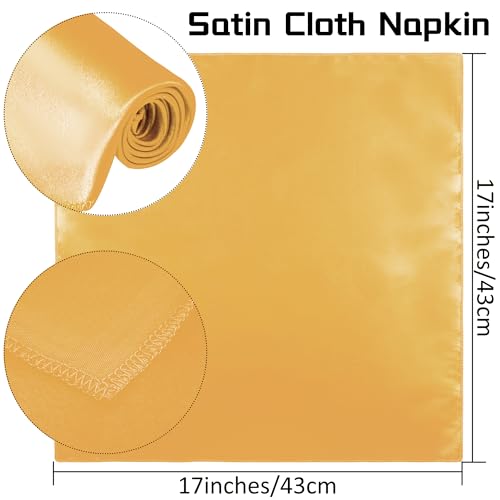 - محتويات العبوة: سوف تحصل على 12 قطعة من مناديل الساتان بلون ذهبي، مقاس كل منها 17 × 17 بوصة/ 43 × 43 سم، الكمية كبيرة جدًا، كافية للاستخدام اليومي والاستبدال