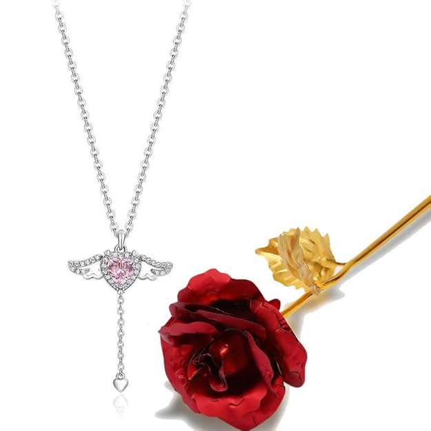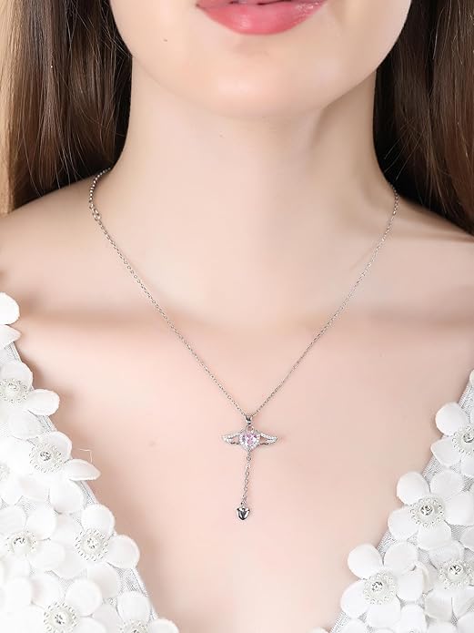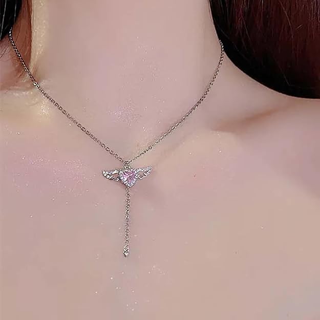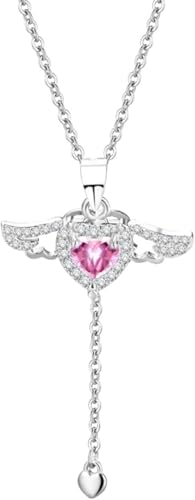 Generic - عقد بقلادة على شكل قلب على شكل اجنحة ملاك، حجر الراين الكريستالي، قلب بينك، سلسلة فضية