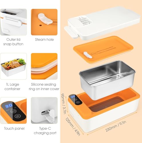 Angju - انجو صندوق غداء كهربائي لاسلكي، صندوق غداء ساخن لا يحتاج إلى ماء مع حقيبة معزولة للسيارة/المنزل، صندوق غداء كهربائي USB للبالغين سعة 1 لتر، وعاء من الستانلس ستيل لتسخين الطعام مع شاشة رقمية