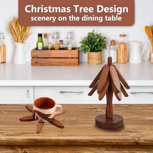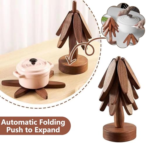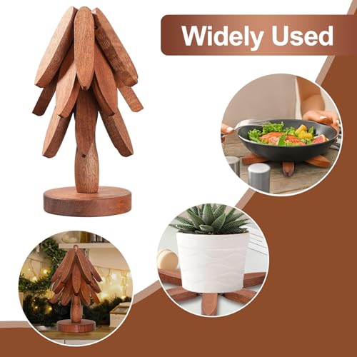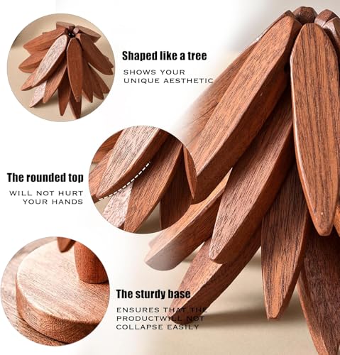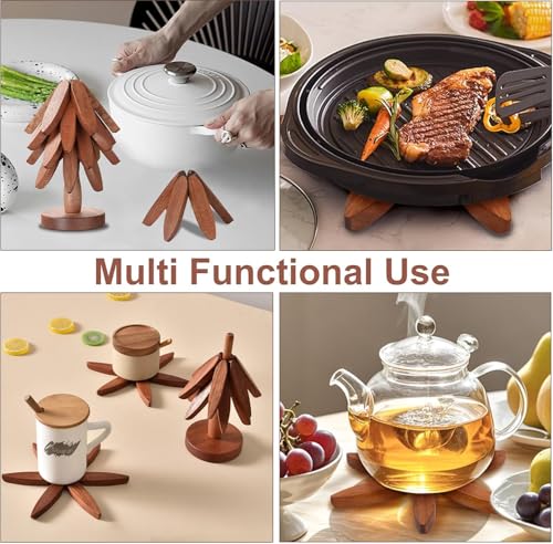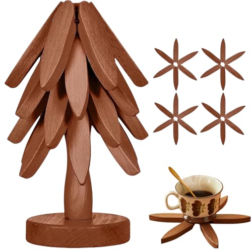 Angju - انجو حوامل خشبية للاطباق الساخنة، مجموعة حوامل على شكل شجرة، 4 حوامل خشبية + 1 حامل، حامل للاطباق الساخنة، حامل خشبي طبيعي قابل للطي، للاطباق الساخنة، الاواني، الاطباق، ابريق الشاي، حوامل الاواني