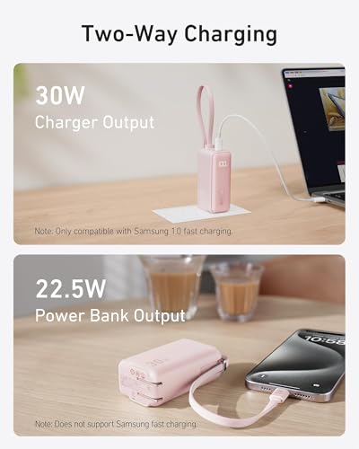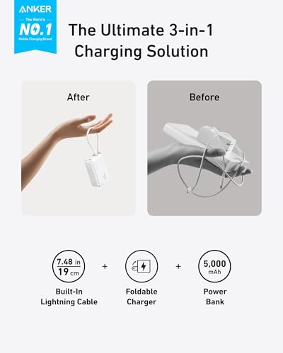 - شاحن باور بانك USB نوع سي 3 في 1 من انكر، شاحن محمول 5000 مللي امبير في الساعة مع كابل USB نوع سي مدمج ومقبس تيار متردد قابل للطي 30 وات كحد أقصى حزمة بطارية مدمجة لسلسلة آيفون 15 وجالاكسي وماك بوك وغيرهم