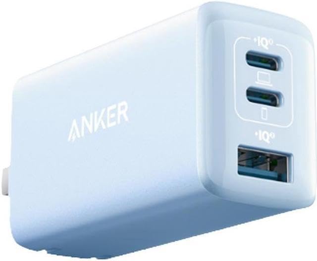 Anker - شاحن سريع 65 وات A2332 بـ 3 منافذ مع قابس قابل للطي - محول طاقة مزدوج USB-C + USB-A صغير الحجم لماك بوك برو / اير وآيفون 15/14/13 اي باد برو وجالكسي S23 / S22 وبيكسل وساعة آبل - أزرق من انكر