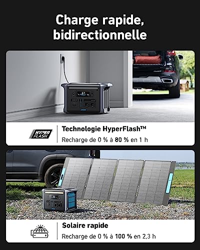 - شحن سريع للغاية: بدلاً من الانتظار لساعات، يمكنك شحن جهازك بنسبة 80% في ساعة واحدة فقط بفضل تقنية هايبر فلاش. الشحن بالطاقة الشمسية سريع أيضًا: يمكنك شحن انكر SOLIX F1200 إلى 80% في 3.6 ساعات عبر الطاقة الشمسية.