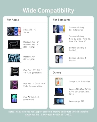 - شحن فائق السرعة 240 واط: اشحن جهاز ماك بوك برو مقاس 16 بوصة (M3 Pro) بكفاءة إلى 50% في 26 دقيقة فقط باستخدام هذا الكابل عالي السعة 240 واط. (ملاحظة: هذا الكابل لا يدعم عرض الوسائط.)