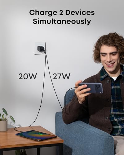 - اشحن جهازين في وقت واحد: بفضل قدرة 27 وات من منفذ USB نوع C واحد، و20 وات من الآخر، يمكنك شحن موبايل آيفون وجهاز اي باد بسرعة في نفس الوقت.