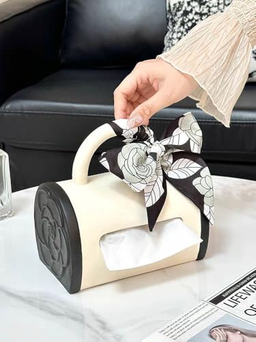 - تصميم أنيق: حامل علبة مناديل أنيق من السيراميك على شكل حقيبة يد يتميز بنظام ألوان أسود وأبيض متطور مع لمسة فيونكة مزخرفة تضيف لمسة عصرية إلى أي ديكور للغرفة