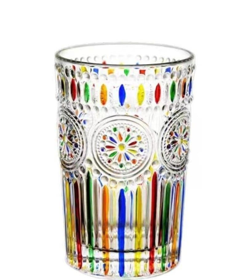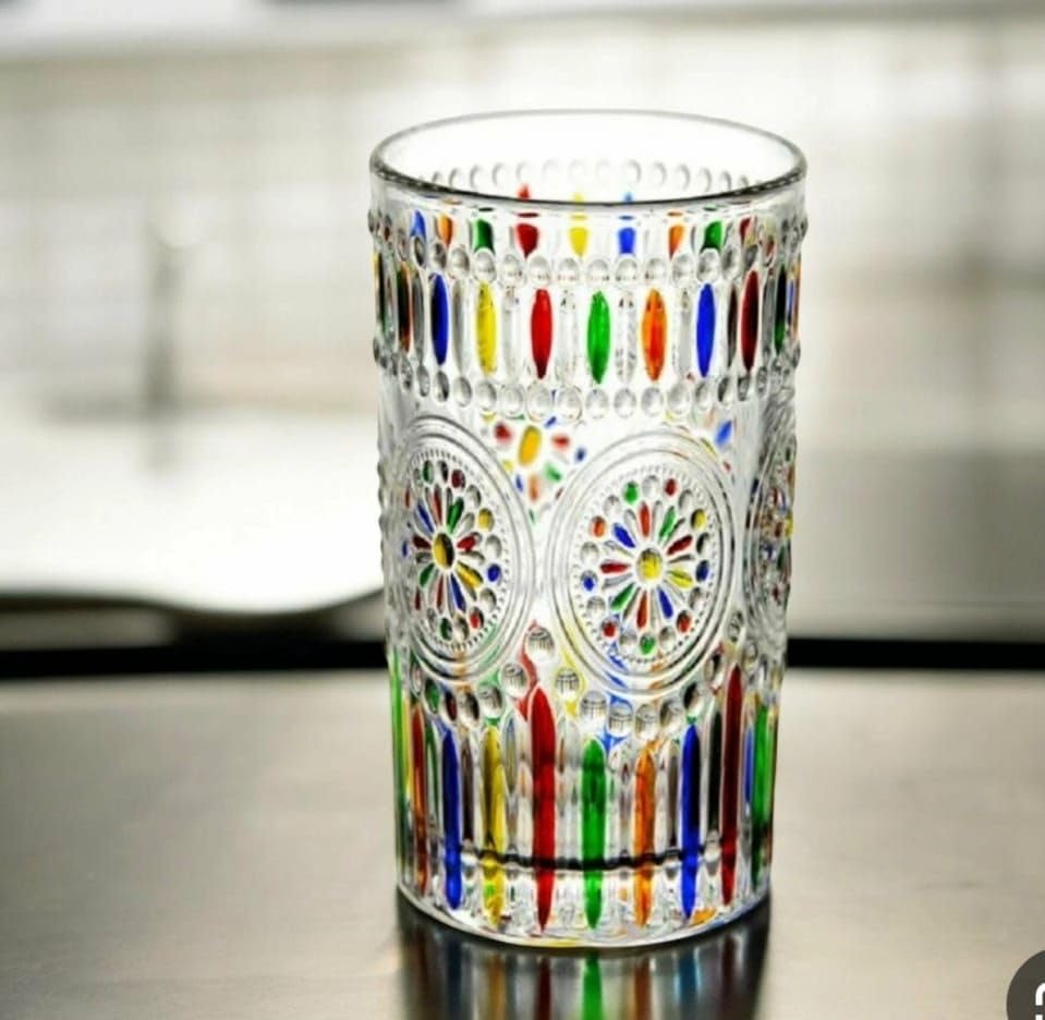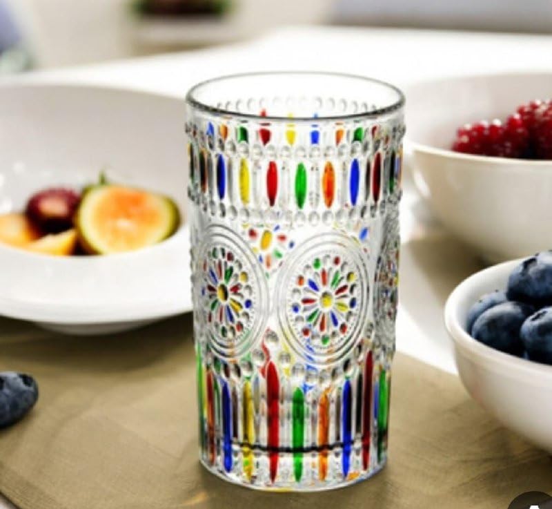 - تصميم أنيق: كوب زجاجي كريستالي مزخرف يتميز بأنماط متعددة الألوان نابضة بالحياة مع ميدالية معقدة وتفاصيل خطوط عمودية تضيف لمسة احتفالية إلى أي إعداد طاولة