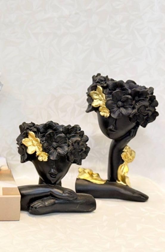 Generic - فازة مزخرفة من عنخ هوم سبلايز بتصميم تمثال نصفي على شكل رأس مزخرف مزود بتاج زهور، تماثيل باللون الذهبي والأبيض والأسود، تمثال فني عصري، مجموعة مكونة من قطعتين، لون أسود