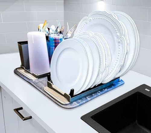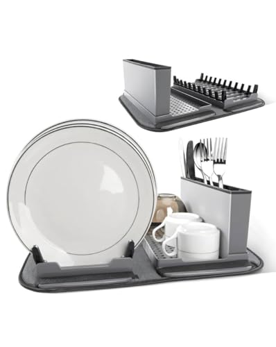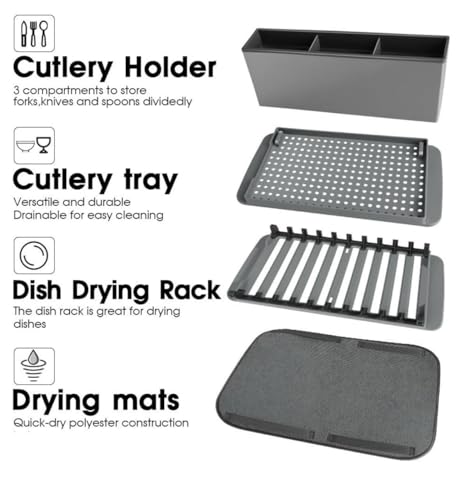 - حل كامل لتجفيف الأطباق: تتضمن مجموعة رف الأطباق الشاملة هذه صينية تصريف ورف تجفيف الأطباق وحامل أدوات المائدة مع 3 مساحات تخزين وسجادة بوليستر سريعة الجفاف لجميع احتياجات تجفيف المطبخ