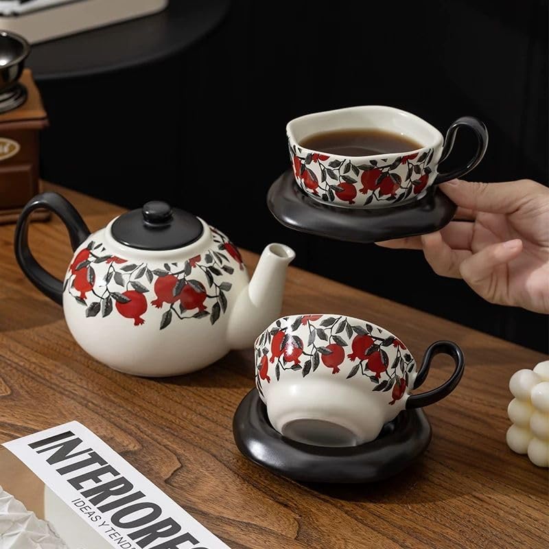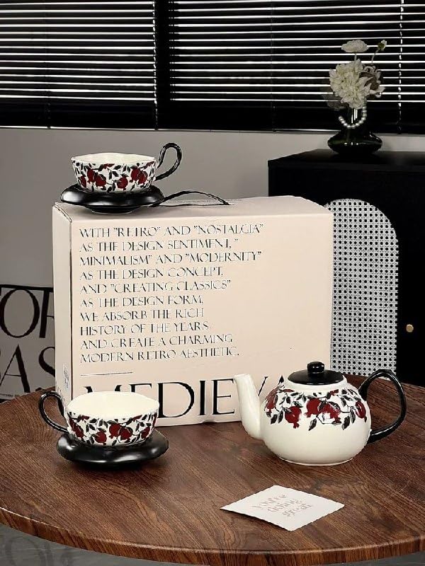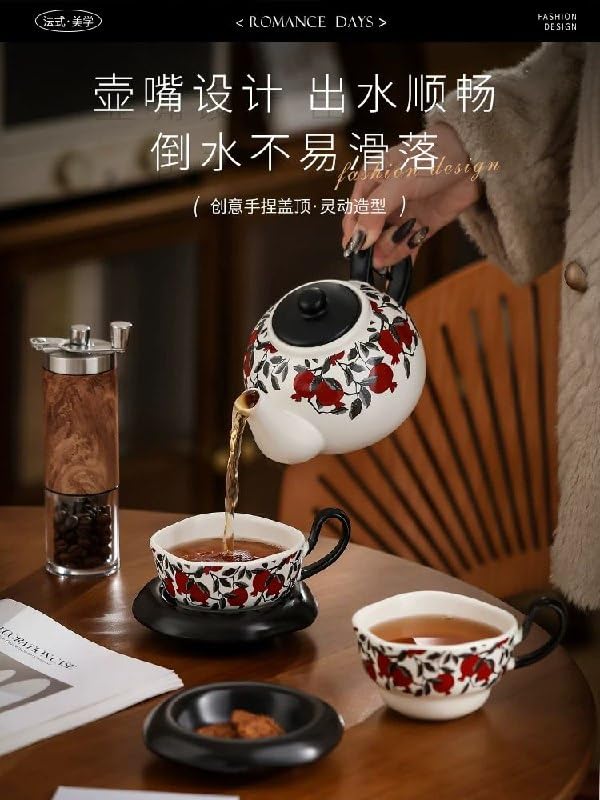 - تصميم أنيق: طقم شاي بورسلين يتميز بنمط زهور حمراء مذهلة على السيراميك الأبيض مع لمسات سوداء، مثالي لخدمة الشاي التقليدية