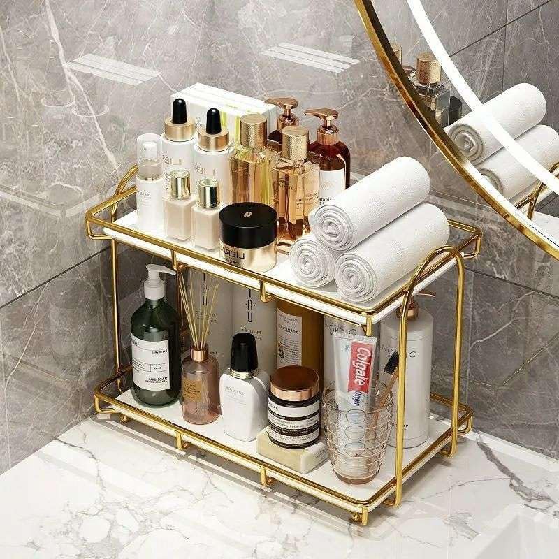 - تصميم أنيق: إطار معدني فاخر بلمسة نهائية ذهبية مع أرفف بتصميم رخامي يوفر حلاً فاخرًا لتخزين الحمام أو أدوات الزينة.