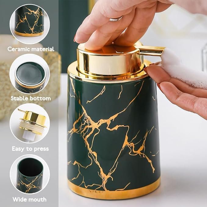 - مجموعة كاملة: تتضمن موزعات صابون متناسقة بأحجام مختلفة، تتميز بآليات ضخ باللون الذهبي الوردي للاستخدام المريح