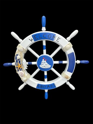 Generic - ديكور حائط على شكل عجلة سفينة من عنخ هوم سابلايز، ابيض وازرق، خوذة خشبية مع لمسات حبل صدف بحري، موضوع بحري للشاطئ (مقاس 45)