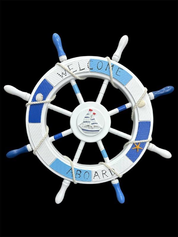 - تصميم بحري: ديكور حائط عجلة سفينة أصلي يتميز بنظام ألوان أبيض وأزرق كلاسيكي مع نص "Welcome Aboard"، مثالي للمساحات ذات الطابع البحري