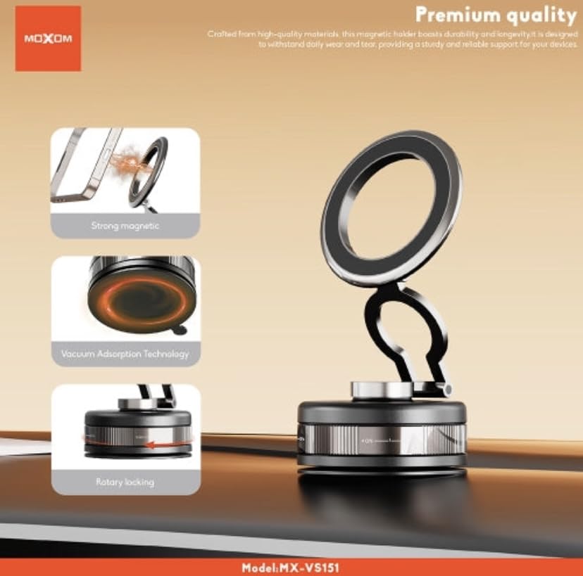 - تثبيت مغناطيسي قوي يحافظ على ثبات هاتفك حتى على الطرق الوعرة، متوافق مع معظم الأجهزة.