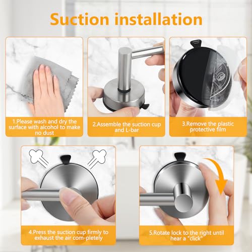 - 【قضيب منشفة قابل للإزالة وإعادة الاستخدام بدون ثقب】تصميم من أربع قطع تجميع سلس. بدون مثقاب، بدون أدوات، حافظ على الحائط. أكواب الشفط مصممة لتوفير الراحة في النقل أو الإزالة. تذكر غسل قاعدة حامل مناشف الحمام وتجفيفها بالهواء قبل إعادة الاستخدام.