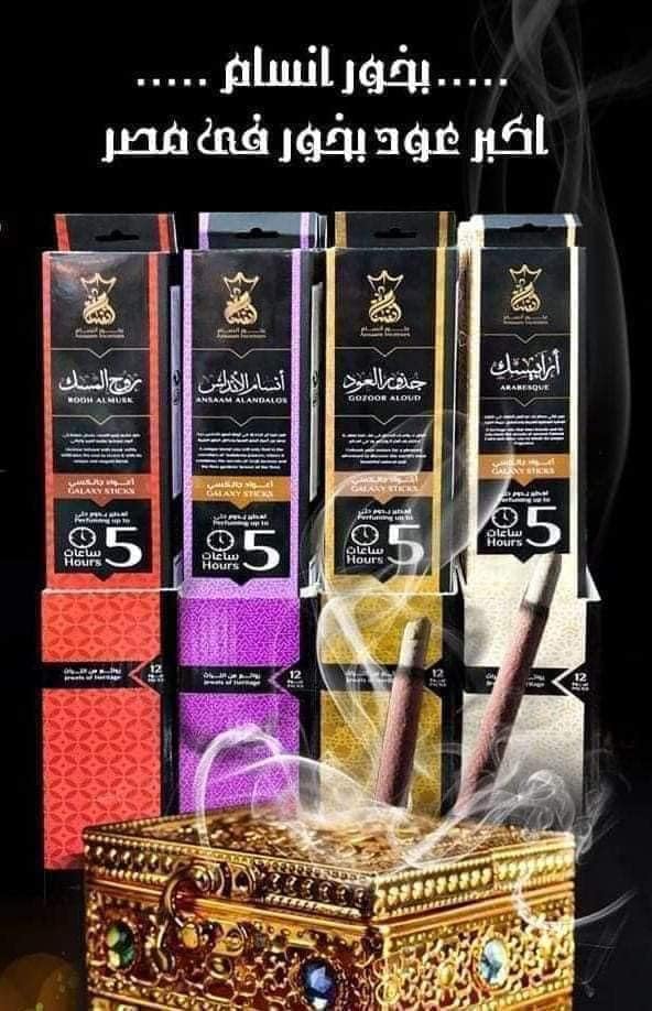- أعواد البخور المصري، تدوم لمدة تصل إلى 5 ساعات ويدوم العطر لمدة تصل إلى 72 ساعة في الغرفة.