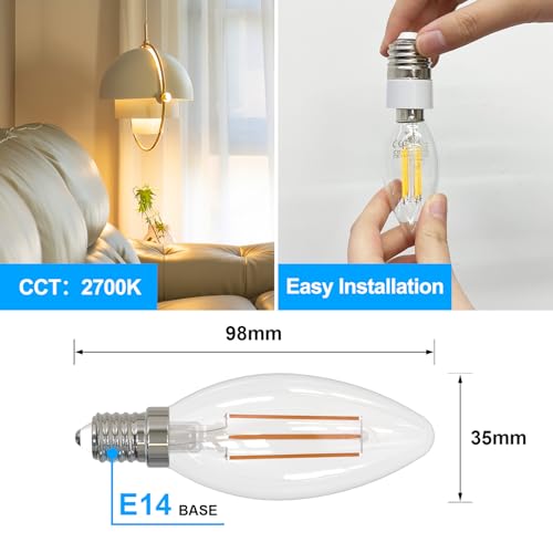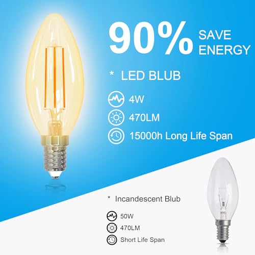 - توفير الطاقة بنسبة 95%: بالمقارنة مع المصابيح التقليدية، يمكن لهذه المجموعة من مصابيح الشموع LED توفير طاقة كبيرة، 4 واط تعادل أداء 40 واط. يدوم حتى 15000 ساعة من الإضاءة.