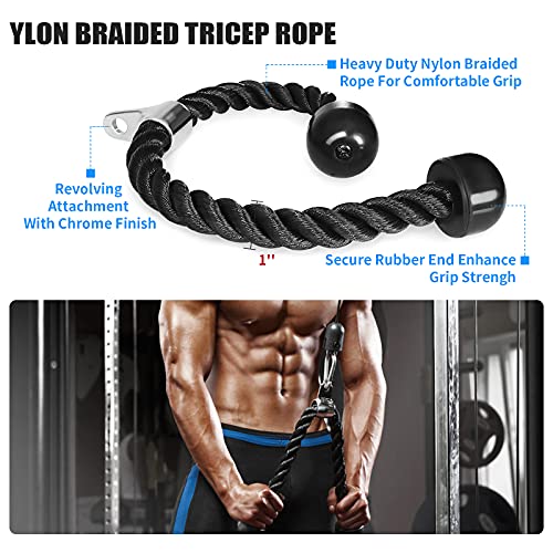 - 💪【حبل ثلاثي الرؤوس مضفر من النايلون】- مصنوع من حبل مضفر من النايلون الأسود شديد التحمل مع أطراف مطاطية صلبة، كما أنه يتميز بدوار من الكروم الصلب الذي يسمح بحركات مرنة لممارسة تمارين السحب ثلاثية الرؤوس.
