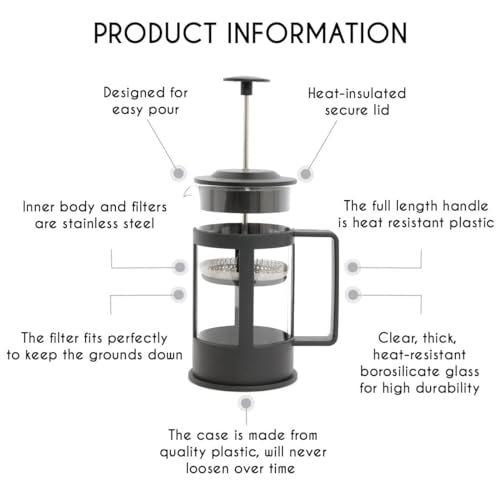 - جودة عالية: ماكينة تحضير القهوة الفرنسية هي ماكينة صنع قهوة جميلة مع زجاج البوروسيليكات الآمن غذائيًا وإطار بلاستيكي متين. مقبض ماكينة تحضير القهوة الفرنسية مقاوم للحرارة لمنع الحروق والتعرض للحرارة. تعتمد جودة مكبس القهوة بشكل كبير على جودة عنصر الفلتر. لذا فإن اختيار الزنبركات مهم للغاية لتصفية مسحوق القهوة، مما سيؤثر بشكل مباشر على طعم القهوة.