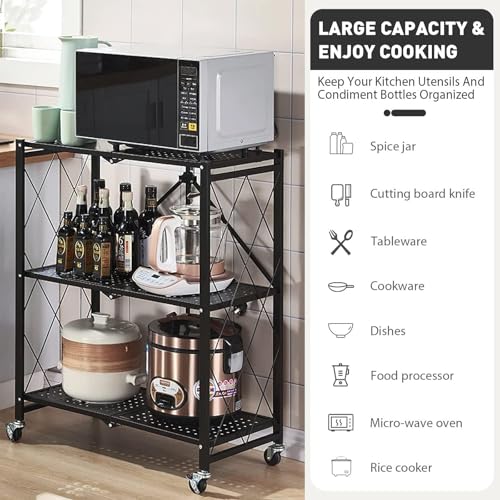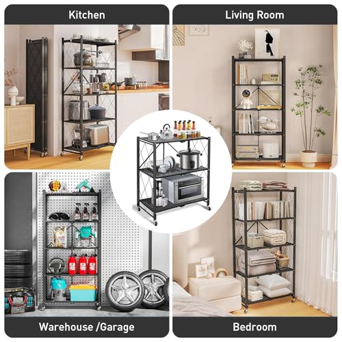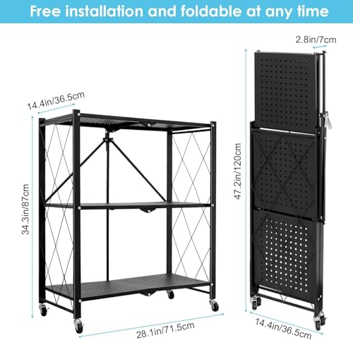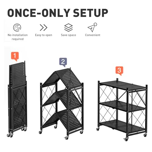 AOMINOHOMA - وحدة رفوف تخزين معدنية 3 أرفف متينة وقابلة للطي مع عجلات لسهولة الحركة، رفوف منظمة رائعة للجراج والمطبخ تتحمل حتى 340 كجم - لون أسود