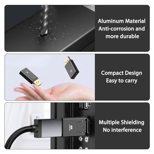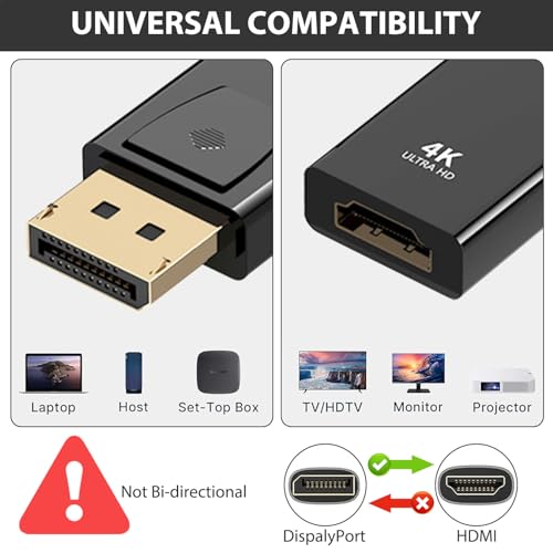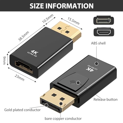 - 4 كيه الترا HD: يدعم محول منفذ العرض إلى HDMI أعلى دقة 4K عند 30 هرتز (ومتوافق مع الإصدارات السابقة 2K عند 120 هرتز، و1080P عند 120 هرتز)، مما يسمح بعرض صور سلسة وواقعية على الشاشة الكبيرة. يمنحك محول HDMI إلى منفذ عرض تجربة عرض ثلاثية الأبعاد غامرة وفريدة حقًا. يرجى ملاحظة ما يلي: كابل HDMI غير متضمن. غير متوافق مع HDMI إلى DP. محول HDMI ليس ثنائي الاتجاه.