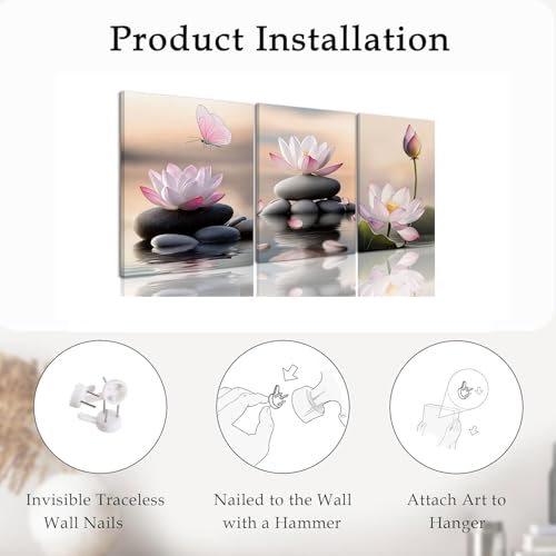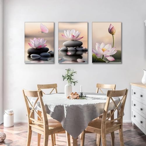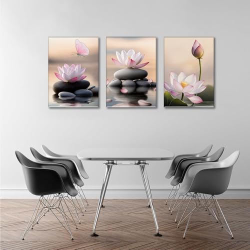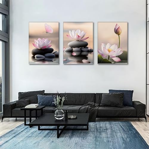 AOYUSMO - لوحة فنية جدارية من 3 قطع من اويوسمو بتصميم زهرة اللوتس الزهري بتصميم زهرة اللوتس الزهري، لوحات ديكور عصرية على شكل فراشة وزهور للحمام واليوغا وغرفة التأمل وغرفة المعيشة مقاس 12 انش × 16 انش