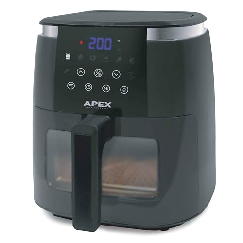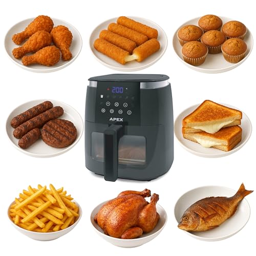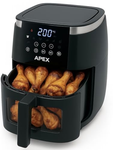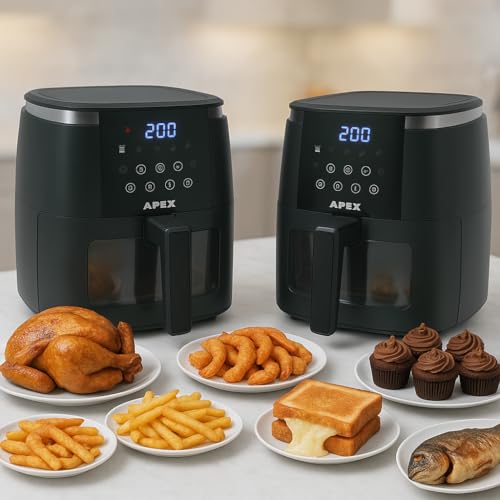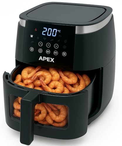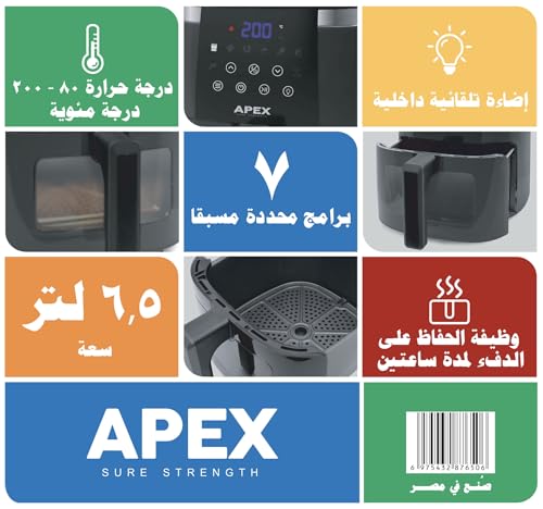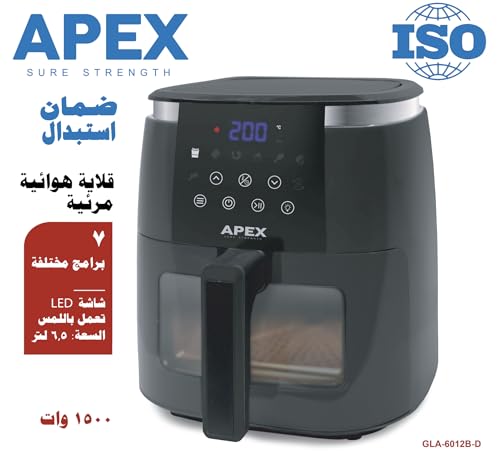 Generic - قلاية هوائية Apex بضمان استبدال لمدة عام كامل - سعة 6.5 لتر فعلي – واجهة شفافة وإضاءة داخلية، شاشة لمس، مؤقت وتنبيه صوتي، سلة غير لاصقة، موفرة للطاقة – لون أسود