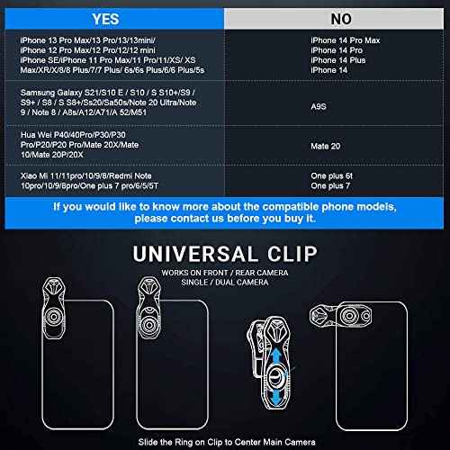 - توافق شامل: مشابك عالمية قابلة للفصل سهلة التركيب والإزالة والتخزين، يمكن لمجموعة عدسات الموبايل أن تناسب معظم أنواع وموديلات الموبايلات، بما في ذلك آيفون Xو8 و7 و6 اس و6 بلس وسامسونج جالاكسي S10/S10 بلس، S8، S7،S7 ايدج وايباد وما إلى ذلك.