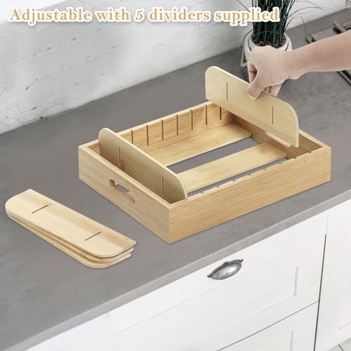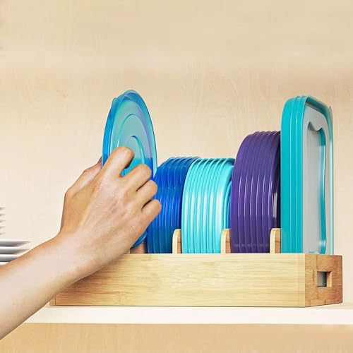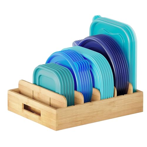APOMOONS - حامل أغطية الأواني من ابو مونز الخيزران منظم أوعية المطبخ الأطباق مطبخ خشبي مع 5 مقابض مقسمة قابلة للتعديل للأواني