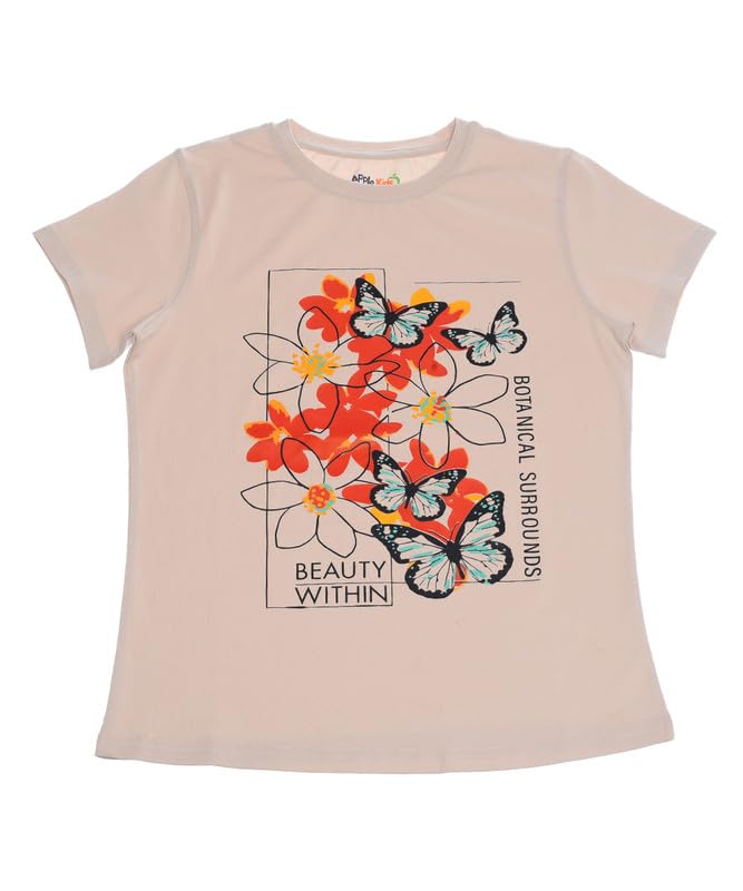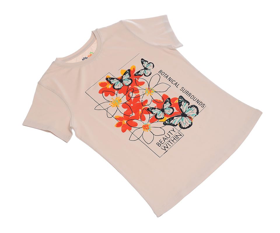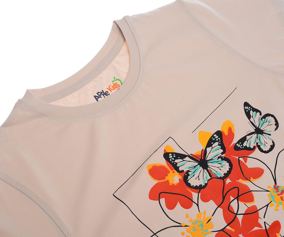 Apple Kids - تيشرت قطن نصف كم مطبوع عليه زهور وفراشة للبنات من ابل