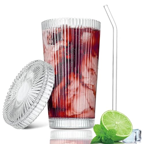 Aputue - كوب زجاج بتصميم مخطط عمودي 375 مل من ابوتو، كوب زجاج مقلم للقهوة المثلجة مع غطاء شفاف وشفاطة منحنية، أواني زجاجية كلاسيك للمياه والقهوة المثلجة والعصير واللبن والشاي