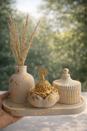 Generic - طقم بونبونيرة مع مبخرة ارابيسك مكون من 7 قطع باللون الابيض مع ورق الذهب
