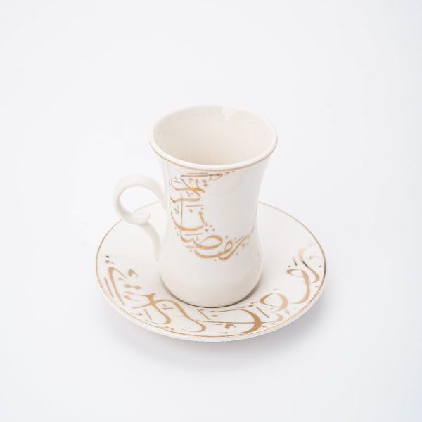 - تصميم أنيق: طقم فناجين شاي وصحون من البورسلين الأبيض مزين بخط عربي متقن وتفاصيل ذهبية أنيقة، مثالي لتجربة شاي تركية تقليدية راقية.