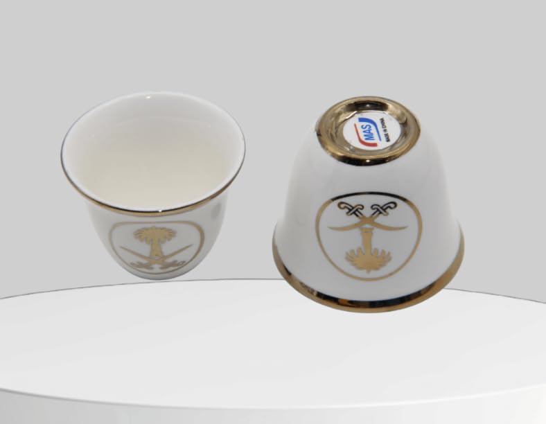 - تصميم أنيق: أكواب قهوة عربية تقليدية مزينة بزخارف ذهبية راقية وشجرة نخيل سعودية مميزة وزخارف سيوف متقاطعة