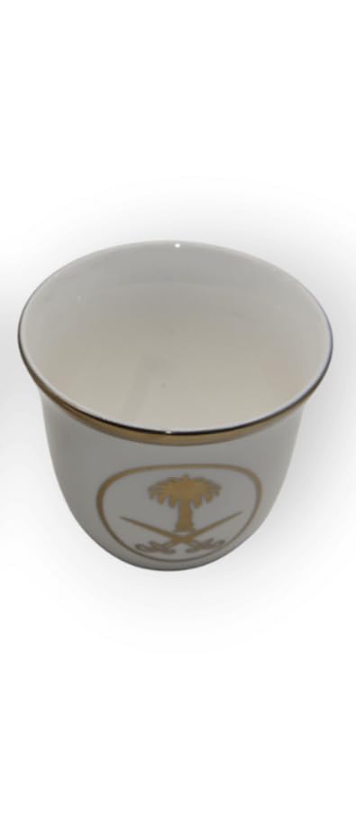 - طقم عملي: مجموعة أكواب قهوة عربية كاملة مكونة من 12 قطعة تتميز بأكواب سيراميك بيضاء أنيقة مع تصميم شعار شجرة النخيل الذهبية