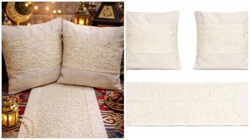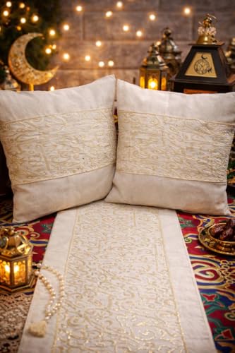 Generic - مفرش طاولة ومخدات، طقم من قماش كتان مزين بخط عربي وتطريز سيرما ذهبي لغرفة المعيشة وترابيزات تناول الطعام والمناسبات الخاصة، 1 طقم من 3 قطع