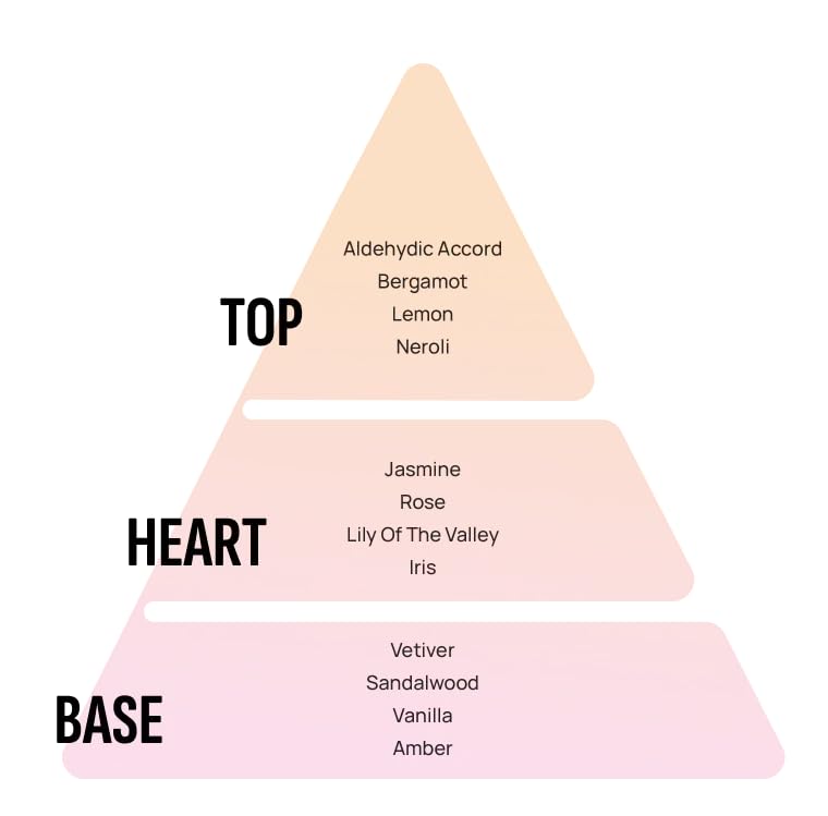 - أول ما يبرز على السطح هو الألدهيدات واليلانج يلانج وزهر البرتقال والحمضيات. ثم تنبعث الروائح الرقيقة من الورد وزنبق الوادي والياسمين. يعتمد العطر على قاعدة من العنبر والفانيليا اللذيذة وخشب الصندل الدافئ مع روائح شرقية من الباتشولي.