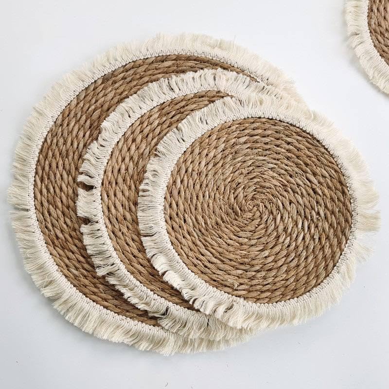 AREXOL - قاعدة اكواب مصنوعة يدويا مع شراشيب من اريكسول 35 سم، خوص طبيعي، مربع، لون عشوائي