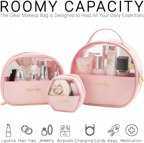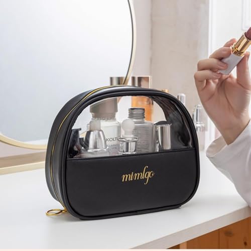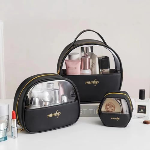 AREXOL - مجموعة شنط مكياج من اريكسول مكونة من 3 قطع بمقاسات مختلفة وتصميم جلدي مع واجهة شفافة بلون اسود وزهري لتنظيم مستحضرات التجميل للنساء مثالية لتخزين المكياج والاكسسوارات (اسود)