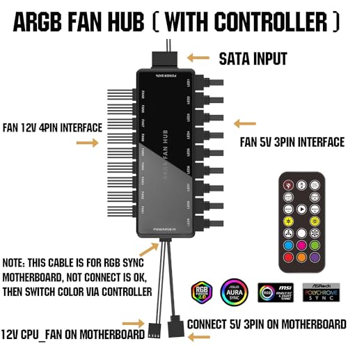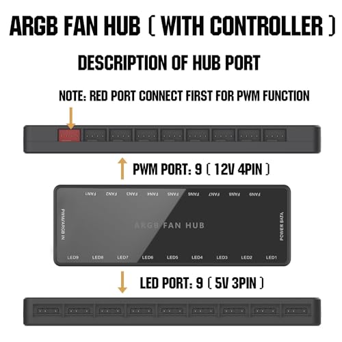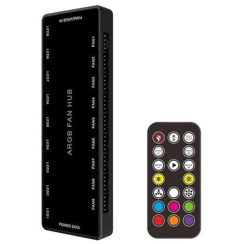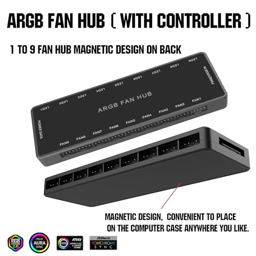 NALACAL - وحدة تحكم في مروحة ARGB مع جهاز تحكم عن بعد، محور مروحة بي دبليو ام يدعم 9 مجموعات من المراوح لـ ARGB 5 فولت 3 دبابيس و12 فولت 4 دبابيس PWM، محور مروحة 2 في 1 RGB مع قاعدة مغناطيسية مخفية وطاقة ساتا