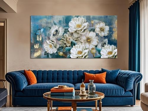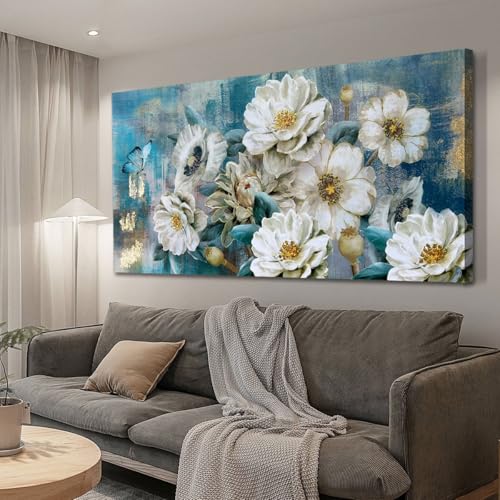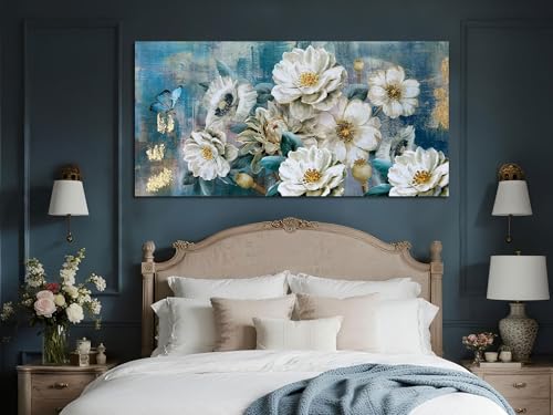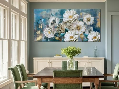 - لوحة فنية جدارية بلون أزرق مخضر: ديكور حائط زهور بيضاء جمالي مثالي لغرفة النوم وغرفة المعيشة وغرفة الطعام والحمام والمنزل والمكتب والمطبخ وغرفة الأطفال وغرفة الحضانة وما إلى ذلك.