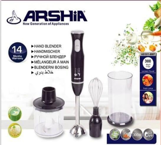 - خلاط يدوي من ارشيا AS1911-8007 مجموعة 3 في 1 عملية بسرعتين شفرة من الفولاذ المقاوم للصدأ كوب 600 مل، مفرمة وخفق 500 مل 220 فولت - 240 فولت ~ 50 - 60 هرتز، 300 وات