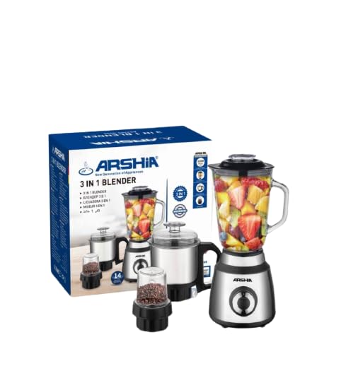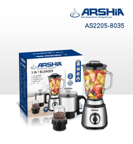 - خلاط ارشيا AS2205-8035 خلاط 3 في 1 محرك نحاسي كامل · 4 سرعات ووظيفة النبض وعاء زجاجي سعة 15 لتر · شفرات من الفولاذ المقاوم للصدأ · الفولاذ المقاوم للصدأ مطحنة جسم من الفولاذ المقاوم للصدأ · AC220-240V 50/60 هرتز 350 واط