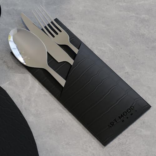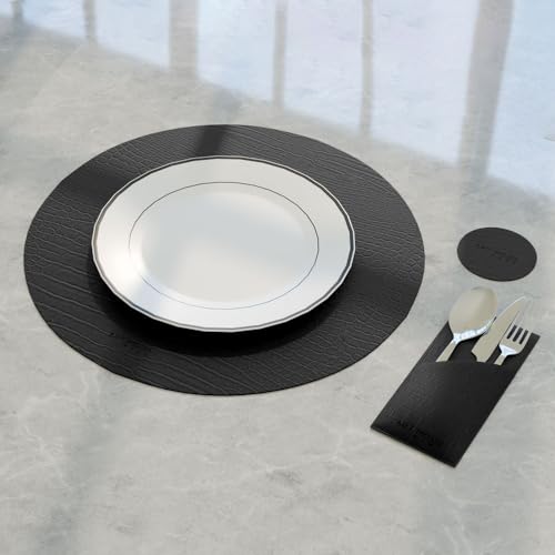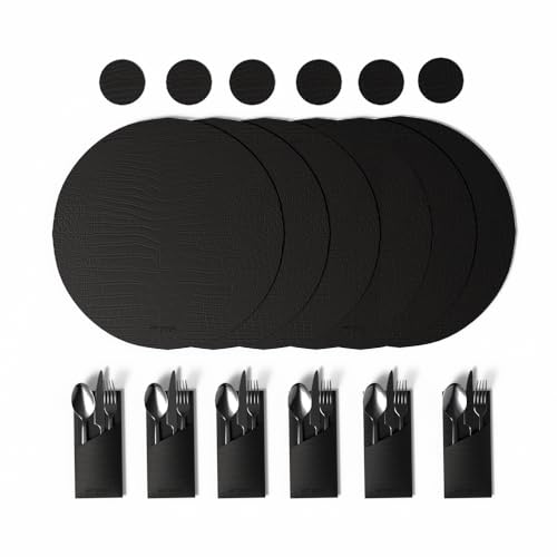 ART MOOD HOME - طقم مفارش مع قواعد أكواب وحوامل لحماية ترابيزة الطعام، مصنوعة من الجلد الصناعي مقاومة للحرارة والخدوش، من 6 مفارش و6 حوامل و6 قواعد أكواب من ارت مود هوم - أسود
