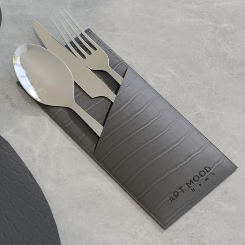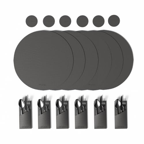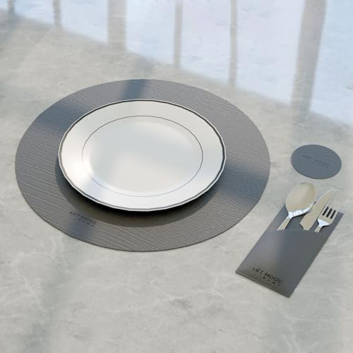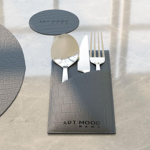 ART MOOD HOME - طقم مفارش طاولة من الجلد الصناعي مقاوم للحرارة والخدوش، مكون من 6 مفارش، 6 قواعد أكواب، 6 حوامل من ارت مود هوم - لون رمادي
