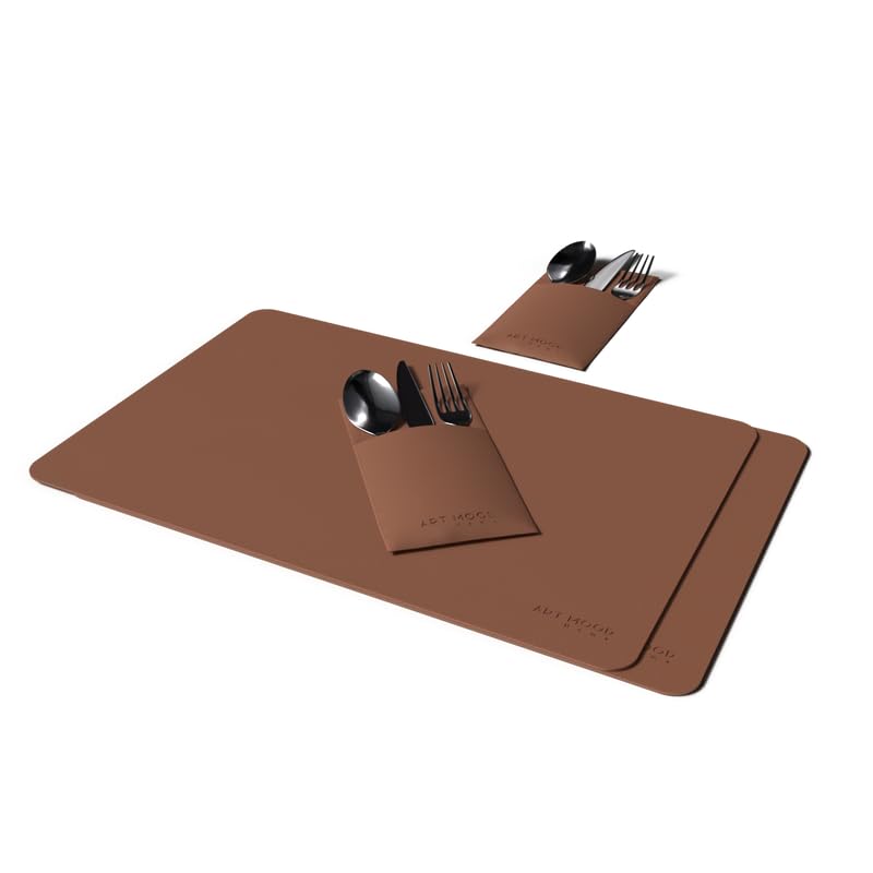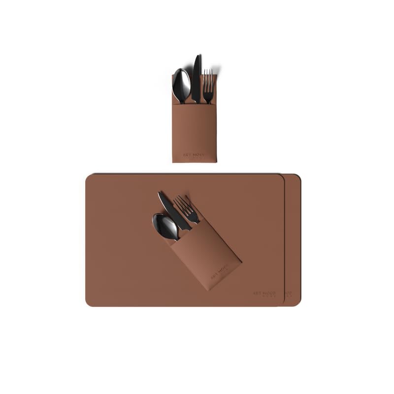 ART MOOD HOME - مفرش من الجلد مع حامل أدوات مائدة، مجموعة من مفرشين و6 حوامل أدوات مائدة متينة لأطباق العشاء وطاولة الطعام، بني هافان، 45 سم × 30 سم (عرض×طول) و10 سم × 17 سم (عرض×طول) من ارت مود هوم